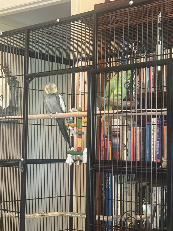 12:50 pm I have cleaned both bird cages. I put both birds in Kermie’s cage which I had cleaned first then set to cleaning Beau’s cage. They both looked at me with annoyance.