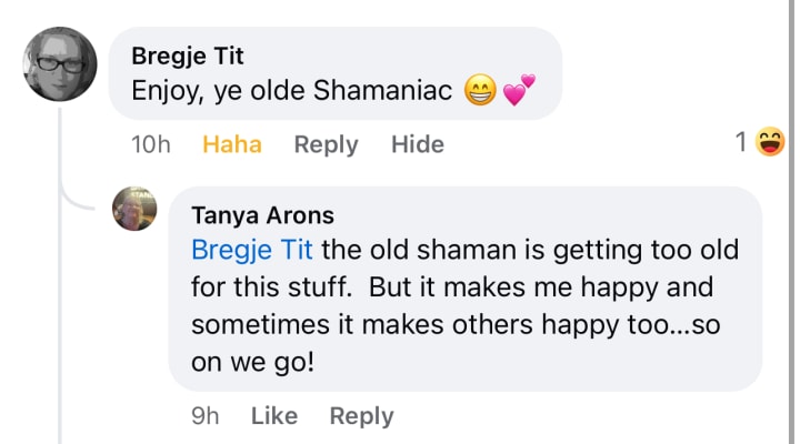 The Tanya will be expressing her full spirituality this evening in her own Shamaniac way…doing the mosh or as much of a mosh as her neck will permit. (sniggers). Love you all.