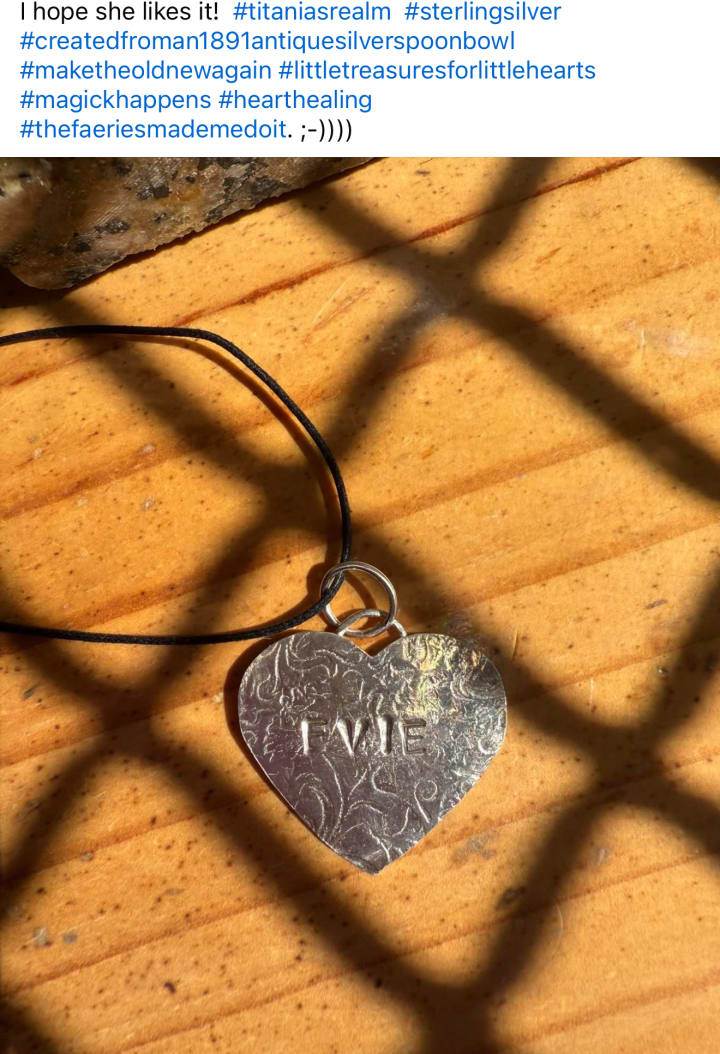 Yesterday I got the urge to make something out of silver spoon bowls I had left over for casting. I decided to make a pendant for little Evie. So I annealed two spoon bowls. Smashed them flat, got out my disc cutter (which has heart shapes). Cut out two hearts. Then textured them both.