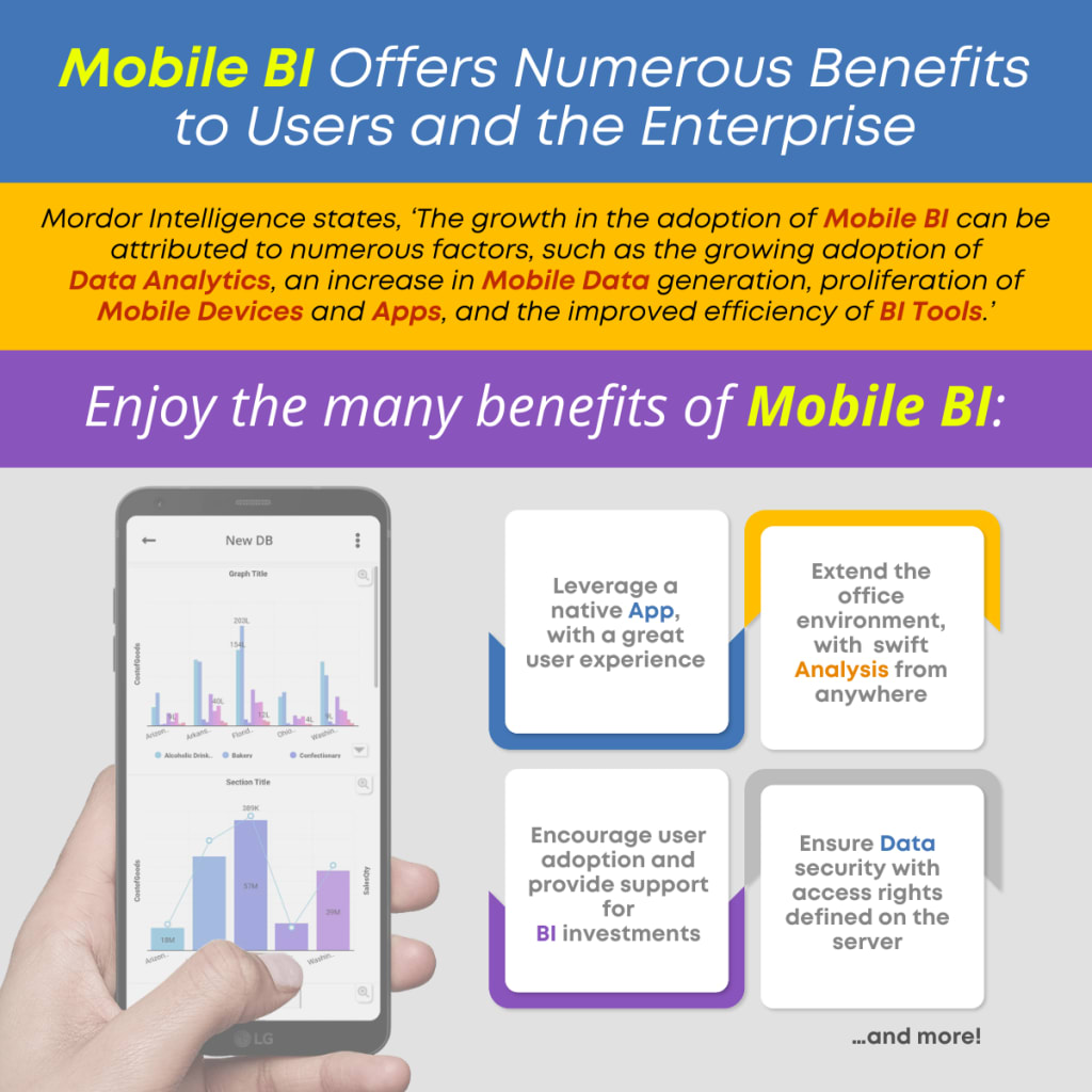 Mordor Intelligence states, ‘The growth in the adoption of mobile BI can be attributed to numerous factors, such as the growing adoption of data analytics, an increase in mobile data generation, proliferation of mobile devices and apps, and the improved efficiency of BI tools.’