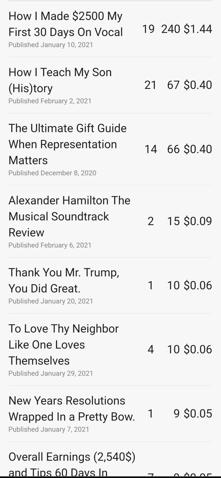 First, I'm going to go over my earnings over the last 6o days. What I did and what I should have done to get my reads and then we can drop right into the tips of having success on Vocal.