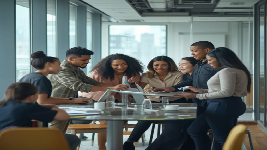 The presence of diverse individuals in the photo symbolizes a multicultural workplace. To survive in the current global market, this diversity is essential. People come from different backgrounds, and their work styles vary. When they sit around a table for discussion, multiple solutions emerge for a single problem. Someone might be technically proficient, while another is skilled in communication or planning. When all these elements coordinate, an organization truly succeeds.