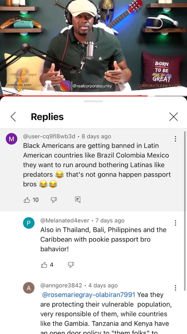 Black Americans are not getting banned all over, this person is talking about the Passport Bros, which I've written about before. This is about men being predators in other countries. Last I checked men in Ghana are still murdering and raping women and children. So therefore they're also not safe. Just like the 2 Ghanaian men in early 2024 in USA that killed their lovers.