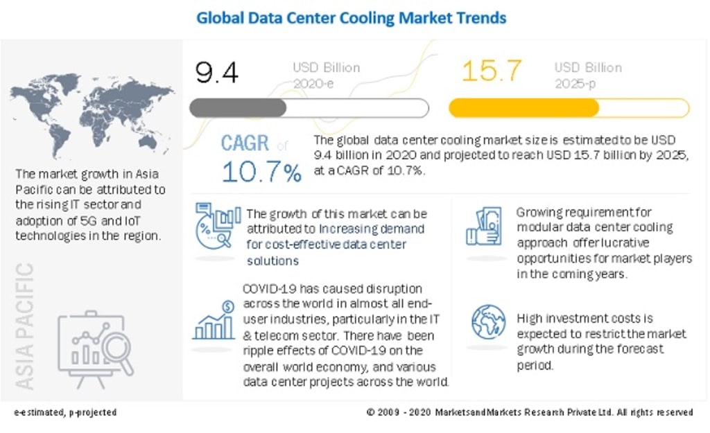 Data Center Cooling is in high demand as the number of data centers and the amount of data they contain increases. The need for efficient cooling systems is especially important in large data centers, where heat generated from servers and other equipment can become overwhelming. Data Center Cooling systems help maintain the temperature and humidity levels at an optimal level, allowing for the efficient operation of IT equipment. Additionally, cooling solutions help to reduce the risk of system failure due to overheating. The "Data Center Cooling Market by Solution (Air Conditioning, Chilling Unit, Cooling Tower, Economizer System, Liquid Cooling System, Control System & Others)", the global Data Center Cooling market is expected to increase from USD 9.4 billion in 2020 to USD 15.7 billion by 2025, in a CAGR of 10.7%.