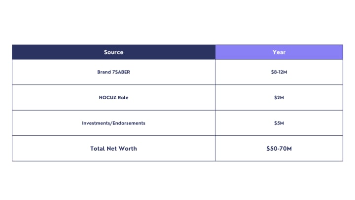 As of 2025, Otabek Umarov has a net worth estimated between 50-70 million dollars that is attributed to business enterprises and endorsements. The main income is realized through Brand 7SABER (annual revenue of at least $10M), NOCUZ salary, and investments. His asset allocation is intelligent and he has assets both in property and stocks.