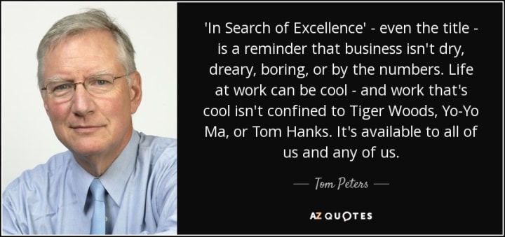 Since the early 1980s, also when I walked uphill (both ways, of course) through the snow to college in the badlands of East Texas, In Search of Excellence was required reading in probably a half dozen classes. In the days before Google and Wikipedia became the modern students' best friend, having to read the same book for multiple classes was basically the best luck a student could have "back in the day." So, I became a Tom Peters "expert," as I got to use my "Mental SparkNotes" on In Search of Excellence time and time and time again during my time as an undergraduate, even extending into my graduate years and beyond.