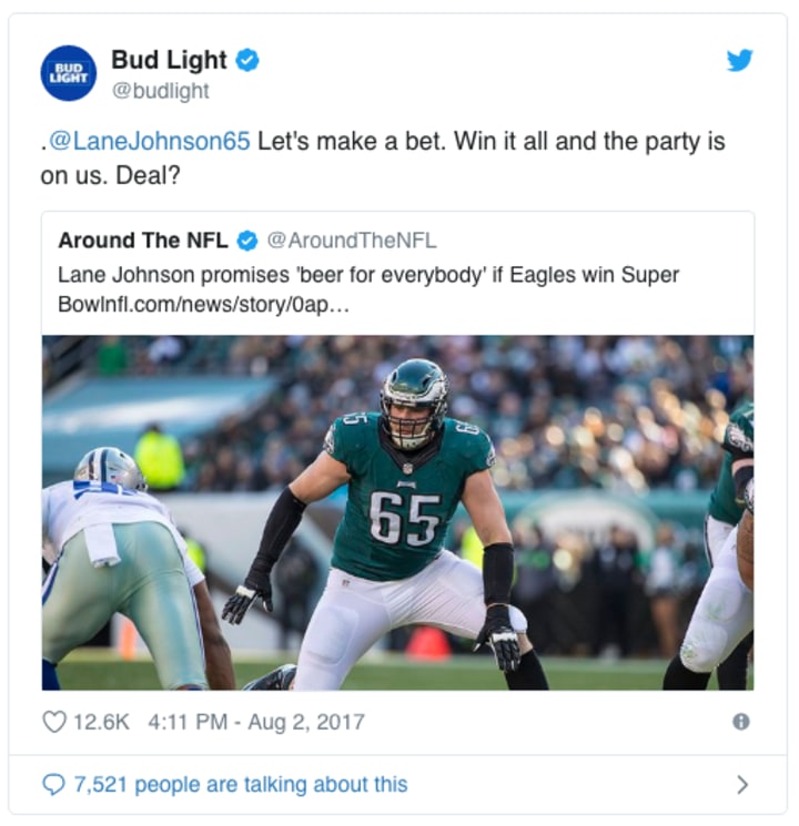 Now that is not to say that all of this getting close to the customer "stuff" is for pure purposes and that the company isn't interested in moving a whole lot of beer! On the sports front alone, in just the past two NFL seasons, the Bud Light brand has been able to capitalize on the turnarounds of two of pro football's hardest-luck franchises. First, the company made good on a spur of the moment pledge made by Philadelphia Eagles offensive lineman Lane Johnson, who promised everyone in Philly a beer if the Eagles could win their first Super Bowl in the 2017-2018 season. Well, that happened, and Anheuser-Busch InBev picked-up the tab (in the form of free beer given away to thousands at Philadelphia's celebratory post-Super Bowl parade). And just "because," Bud Light was offered-up in special "Philly Philly" commemorative edition cans in the Philadelphia area for fans to buy, yes "buy, buy!"