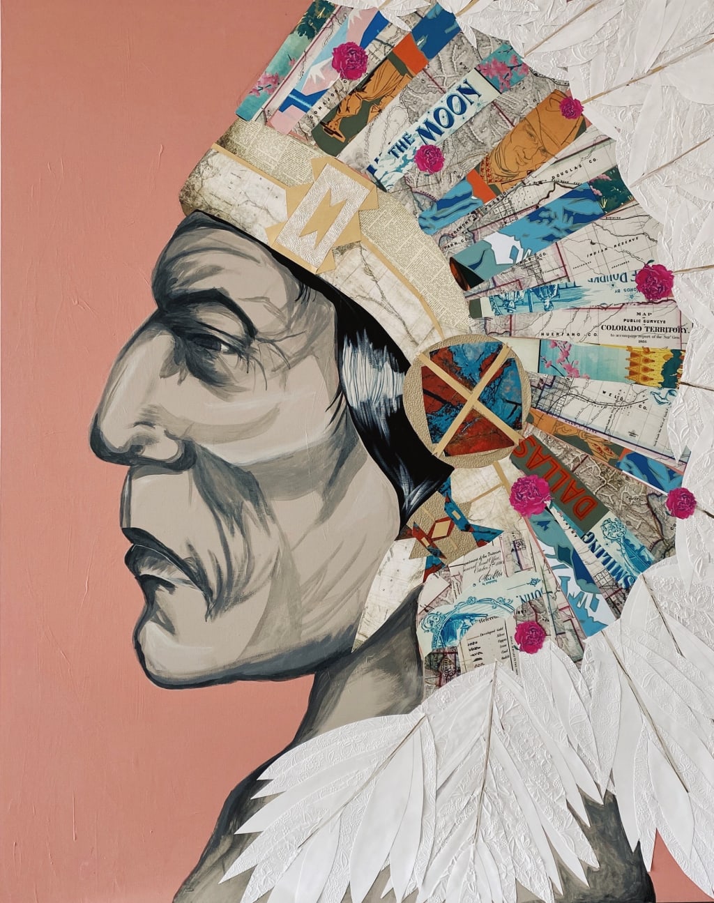 The piece is a 60” tall by 48” wide portrait of the profile of the chief. The face is painted with acrylic, whereas the headdress is carefully crafted through the art of collage. My fingers ached by the end of the 8-week project, hand cutting each feather and small detail that was to be precisely glued for the sake of a bigger beauty. Maps of Colorado land, close-up images of stones, and flowers make up pieces of the headdress - giving life and color to the forgotten chief one puzzle piece at a time. This was the first collage I had ever done, but it sparked a world of interest and clientele for me. Soon after I posted my work on social media, I received many commission offers for similar significant works. Many families had Native American ancestry as well as an appreciation and interest in their culture as I did, so I did two additional commissioned pieces similar to this one that same summer. This project not only opened the doors to my passion for collage art, but it was when I finished my race and realized I could find happiness in making art a profession - a bonus was that it gave me the means to finish my education with a little less debt.