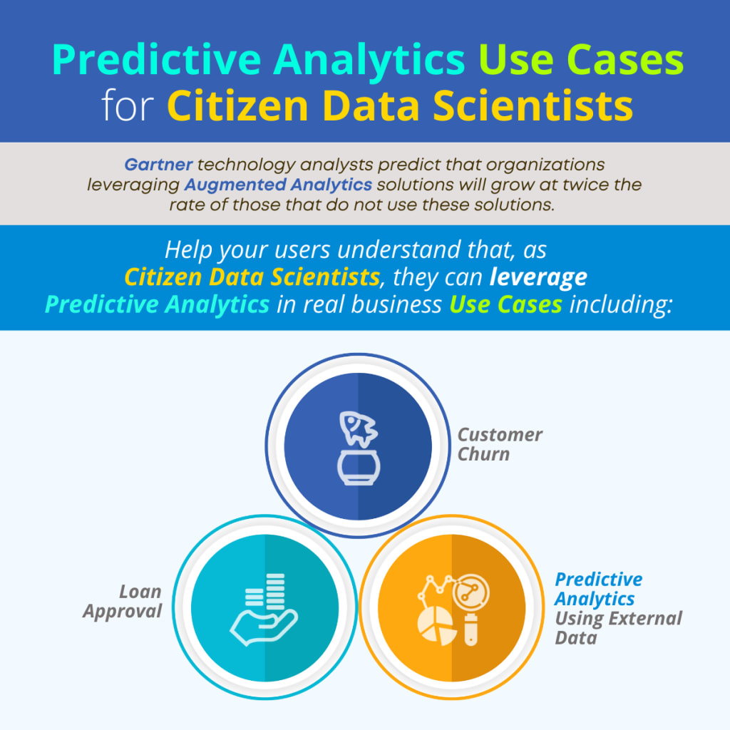 These are just a few of the ways in which a Citizen Data Scientist can use augmented analytics and predictive analytics on a day-to-day basis to test the accuracy of existing policies and decisions and to adapt quickly to the market and competition. You can explore more business use cases for a variety of business functions and industries here: Predictive Analytics Use Cases for Citizen Data Scientists.