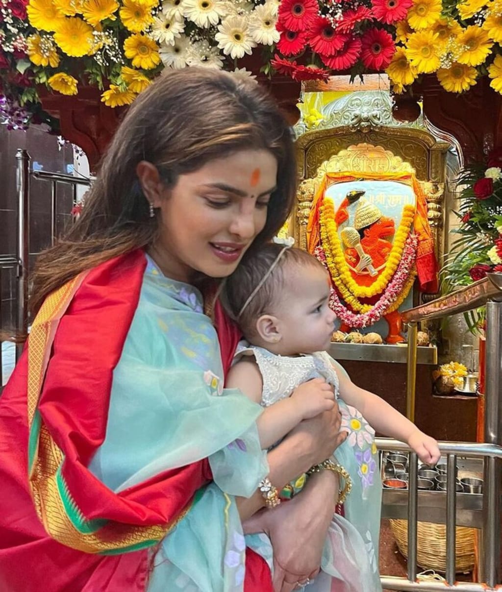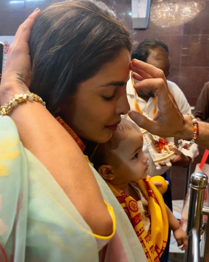 Chopra, a vision in traditional Indian attire, bestows a tangible connection to her roots, her forehead adorned with the emblematic bindi. The cinematic tableau captures the actress cradling Malti Marie, a scene steeped in tenderness, as the young one absorbs the opulent grandeur of the Hindu temple—a tableau that sparks reflection on the passage of time and the continuum of cultural heritage.