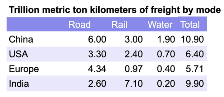 The table of domestic freight ton kilometers by mode above is one I developed recently when thinking about global variances in freight transportation mode starting points for decarbonization. Remarkably, India will be 75% complete on primary decarbonization of domestic freight this year when it completes electrification of heavy rail. China still leverages lower emissions rail and water modes more than most geographies, 75% of its rail is electrified, and its water freight is electrifying. Europe just announced much more stringent decarbonization of its road freight, with 90% decarbonization of new vehicles in 2040, which means electric trucks.