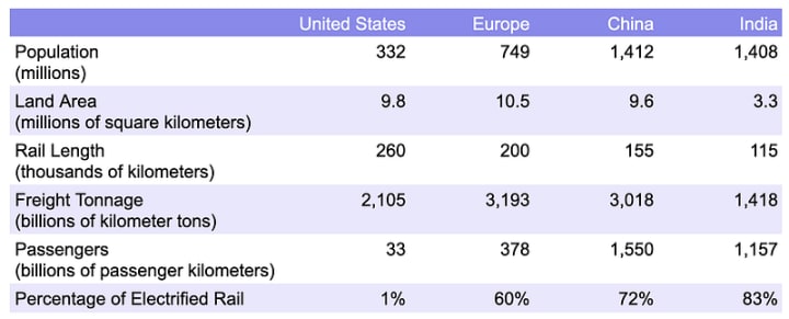 I developed this global rail perspective at the beginning of 2023. It’s already out of date as China is up to about 75% and India is approaching 100% rail electrification. The 1% figure for the US is solely for the incredibly limited passenger rail in the country. There is no electrified freight rail in the country. As I noted at the time, the American Association of Railroads, like the lobbying group for road freight, was quite willing to bend reality to pretend that rail electrification was completely impossible.