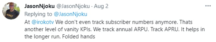 At Irokotv, we don't even track subscriber numbers anymore. Thats another level of vanity KPIs. We track annual ARPU. Track APRU. It helps in the longer run.