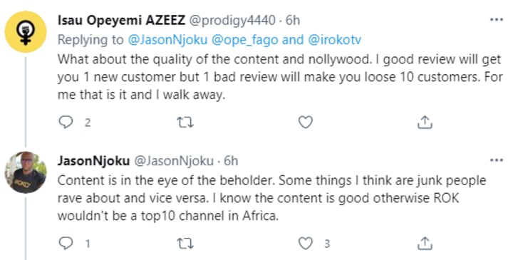 What about the quality of the content and nollywood. I good review will get you 1 new customer but 1 bad review will make you loose 10 customers. For me that is it and I walk away.