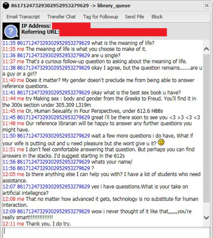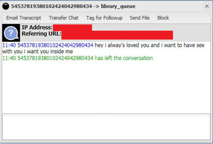 Many libraries offer a chat feature, so people using the site remotely can have access to a qualified professional if they need help. But every so often you get someone whose boredom can only be relieved by making a stranger as uncomfortable as possible.