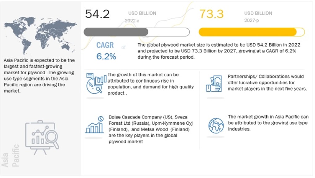 The global plywood market size is projected to grow from USD 54.2 billion in 2022 to USD 73.3 billion by 2027, at a CAGR of 6.2%, According to the MarketsandMarkets™ analysis. Plywood is a well-known manufactured wood-based panel product that has been used in global development projects for many years. Plywood panels for structural applications are made up of many layers or plys of softwood veneer that are bonded together so that the grain direction of each layer of veneer is perpendicular to the grain direction of the layers above it. With a waterproof phenol-formaldehyde resin glue, these cross-laminated sheets of wood veneer are joined together and cured under heat and pressure.