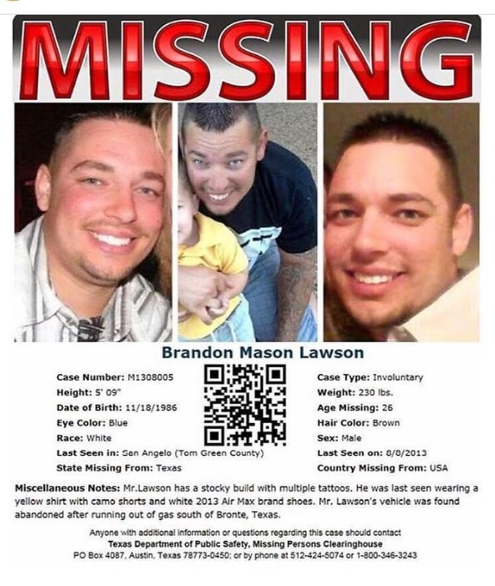 On August 8, 2013, Brandon Lawson, a father of four, stormed out of his home near Bronte, Texas, after a disagreement with his wife. He called the police an hour later when he ran out of gas. He also called his brother Kyle and asked him to bring some gas. When Kyle arrived shortly after 1 a.m. Brandon was nowhere to be found.