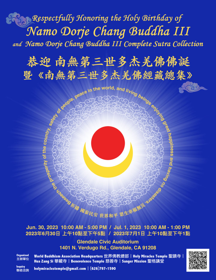 To honor the upcoming Holy Birthday of Namo Dorje Chang Buddha III, the World Buddhism Association Headquarters, Holy Miracle Temple, Hua Zang Si, Benevolence Temple, and the Sanger Mission will jointly organize the Dharma Assembly Respectfully Honoring the Holy Birthday of Namo Dorje Chang Buddha III and the “Namo Dorje Chang Buddha III Complete Sutra Collection” on June 30 (Friday) and July 1 (Saturday), 2023 at 10AM, in the Glendale Civic Auditorium, 1401 N Verdugo Road, Glendale, 91208.