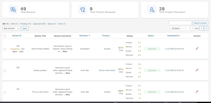 A panel to display all review related information just for the store owner. By analyzing statistics, the store owner can understand the behavior of the customer about the products in his store. A store may have thousand of reviews, and all review information in a brief with search, edit, delete option is just a gift from ReviewX.