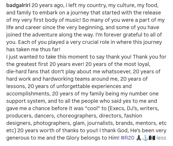 Rihanna pens heartfelt note as she celebrates 20 years in music