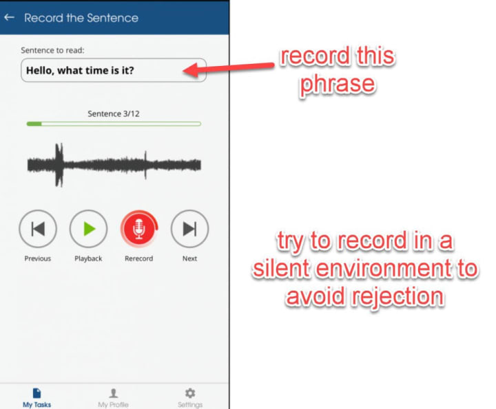 - But there’s a catch! You will be rejected if your voice/accent is not natural. For eg: If a task in the UK, requires a British accent, and you try to complete it, you will be rejected. Don’t try to do voice acting, as you will just be wasting your time.