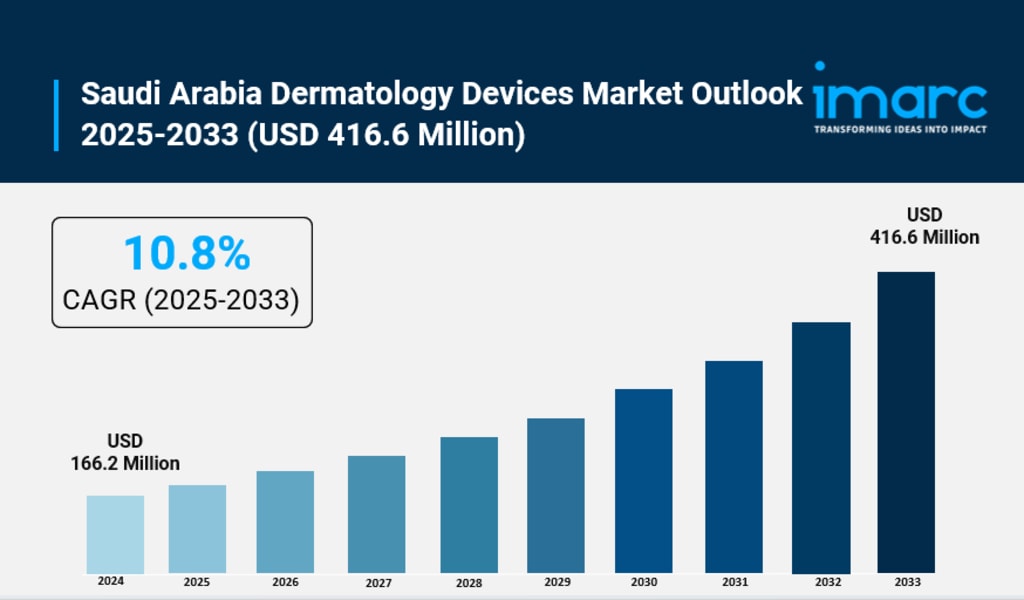 According to IMARC Group's latest research publication, "Saudi Arabia Dermatology Devices Market: Industry Trends, Share, Size, Growth, Opportunity and Forecast 2025-2033", The Saudi Arabia dermatology devices market size reached USD 166.2 Million in 2024. Looking forward, IMARC Group expects the market to reach USD 416.6 Million by 2033, exhibiting a CAGR of 10.8% during 2025-2033.