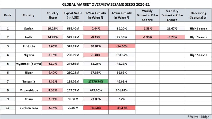 World sesame seed production is estimated at around 4. 8 million tons with 10 countries - Myanmar, India, China, Tanzania, Sudan, Ethiopia, Nigeria, Burkina Faso, Uganda, and Niger accounting for over 80% of the production. Africa collectively accounts for over 45% of the crop and in the last 10 years has grown in stature as a fast-growing supplier of sesame seed to the world market.