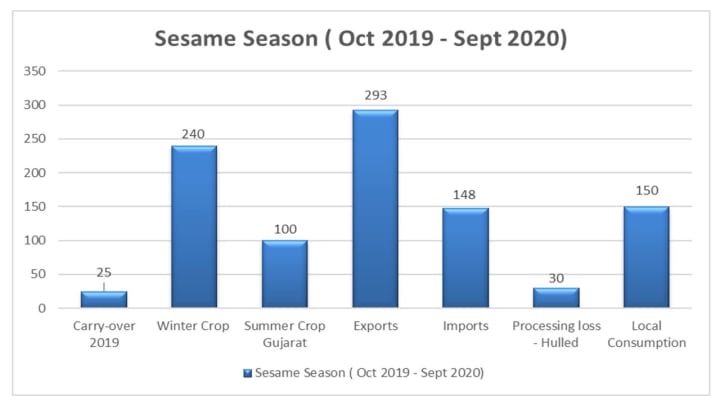 Indian sesame summer crop 2020-21Gujarat has estimated over two-fold rise in summer sesame seed crop this year at 24,490 tonnes (as per third advance estimates), which was 11,650 tonnes in the previous year. In Gujarat, Saurashtra dominates summer sesame seed cultivation with sowing area concentrated in the districts of Junagadh, Rajkot and Surendra nagar.