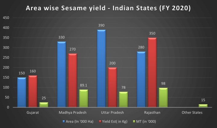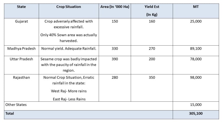 Sesame seed is an export-oriented crop, but it is a very sensitive crop requiring sufficient water and favorable climate. The state-wise production of sesame seeds during the winter season can be detailed as below: