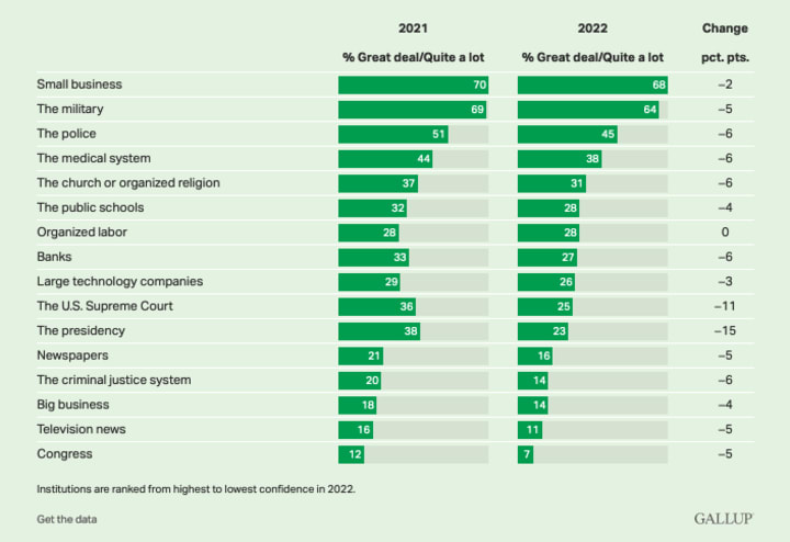 Figure 1 - Gallup: Change in Americans' Confidence in Major U.S. Institutions, 2021-2022