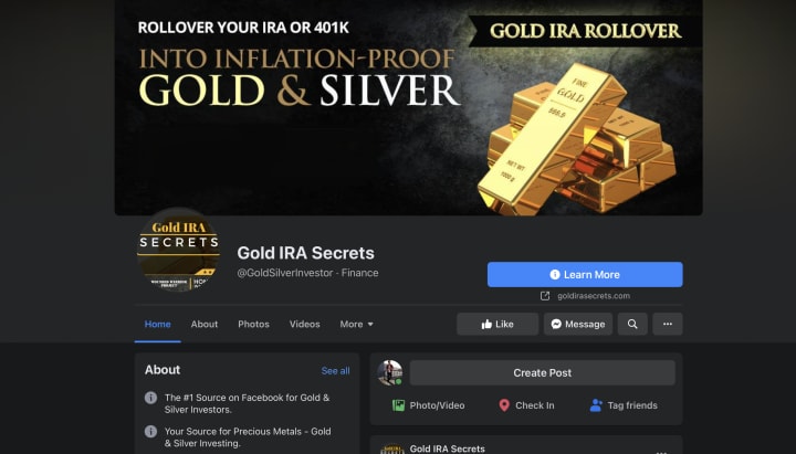 Immediately after you get on their social media page, you can see their cover picture. It's super catchy and gives you a benefit straight on - roll over your retirement plan, inflation-proof gold and silver.