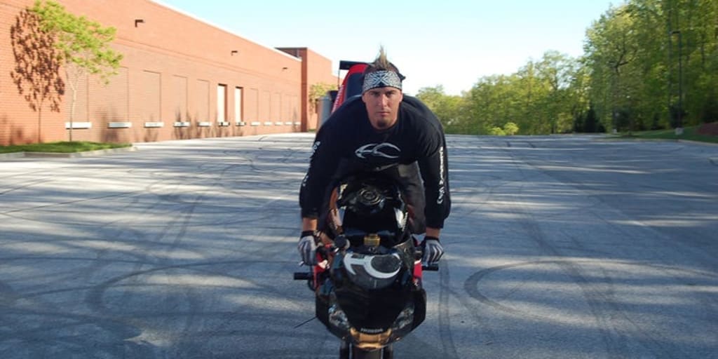 So, back in 2006, I'm doing about 70 mph on my motorcycle -- while popping a wheelie, with my feet stuck out over the windshield -- when I make a mistake. Bam. One second, I’m doing a stunt for a movie on a Maryland interstate, making money for doing insanely entertaining tricks on one of my two wheels. The next second, I’m roadkill -- still breathing (fortunately) but splattered and sprawled on the highway, with no way to call for help.