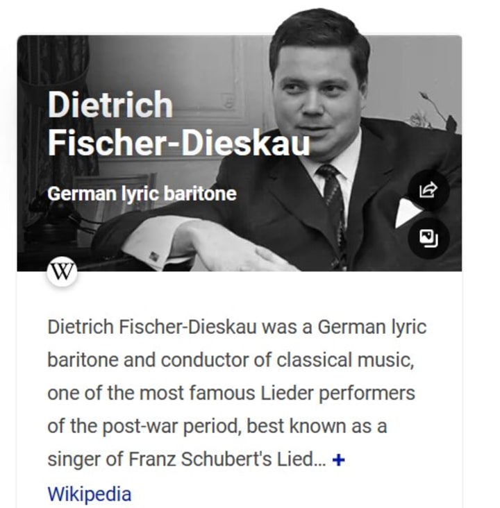 I arrived at eleven as arranged and again Dieter Fischer-Diskau was filling the house with his baritone notes competing with the trills of the birds in the garden. Deutsche Gramophone album covers were scattered on the table.