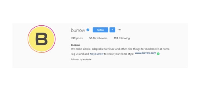 Companies are also including relevant hashtags in their bios to attract followers within a specific niche, increase engagement, and make content easier to find. Online furniture retailer Burrow encourages customers to use their branded hashtag, #myburrow.