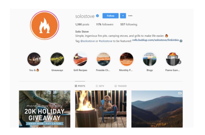 Then, write a standout bio that reflects your brand's personality and connects with your target customers. Solo Stove uses the limited space in their Instagram bio to clearly state who they are and what they do.