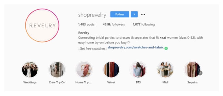 Bridal dress retailer Revelry uses Instagram stories to give out essential product information. That way, customers are free to click through and learn what they want about different items right on their Instagram page.