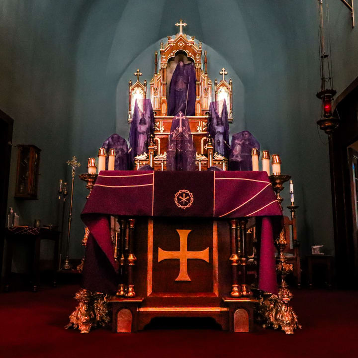 In Catholic Churches, it is customary to veil statues, images, and crosses with purple or black cloths during Passiontide, which spans the last two weeks of Lent. This period begins on the Saturday before the Fifth Sunday of Lent and continues until the Easter Vigil. The Crucifix above or behind the altar is uncovered on Good Friday.