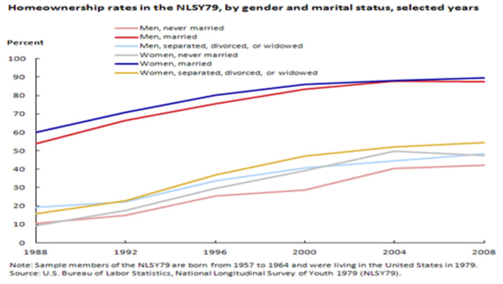 Before looking into anymore statistical data, it is important to gain further knowledge on the collected research and try to understand how social stratification theories fall into place and how things can be seen from a quantitative perspective. For home ownership based on the research done by the U.S Bureau of Labor Statistics, it can be seen the married women carry the peak of percentage at 60% inaugurally in 1988 (Aughinbaugh, 2013). Later continuing the trend until the end of the provided graph in 2008 at 89% (Aughinbaugh, 2013). (Image below).