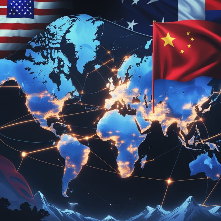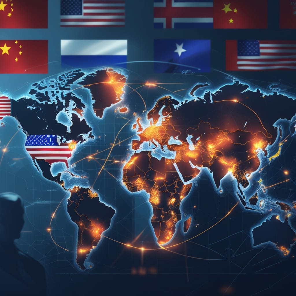 This powerful digital illustration represents the global balance of power, highlighting the influence of major world powers like the United States, China, and Russia. A futuristic world map with glowing connections between cities symbolizes diplomatic ties and geopolitical influence. Subtle silhouettes of political leaders and national flags blend into the background, portraying the ever-changing dynamics of global leadership. The artwork reflects the complexity of international relations and public perception of world powers in shaping the future.