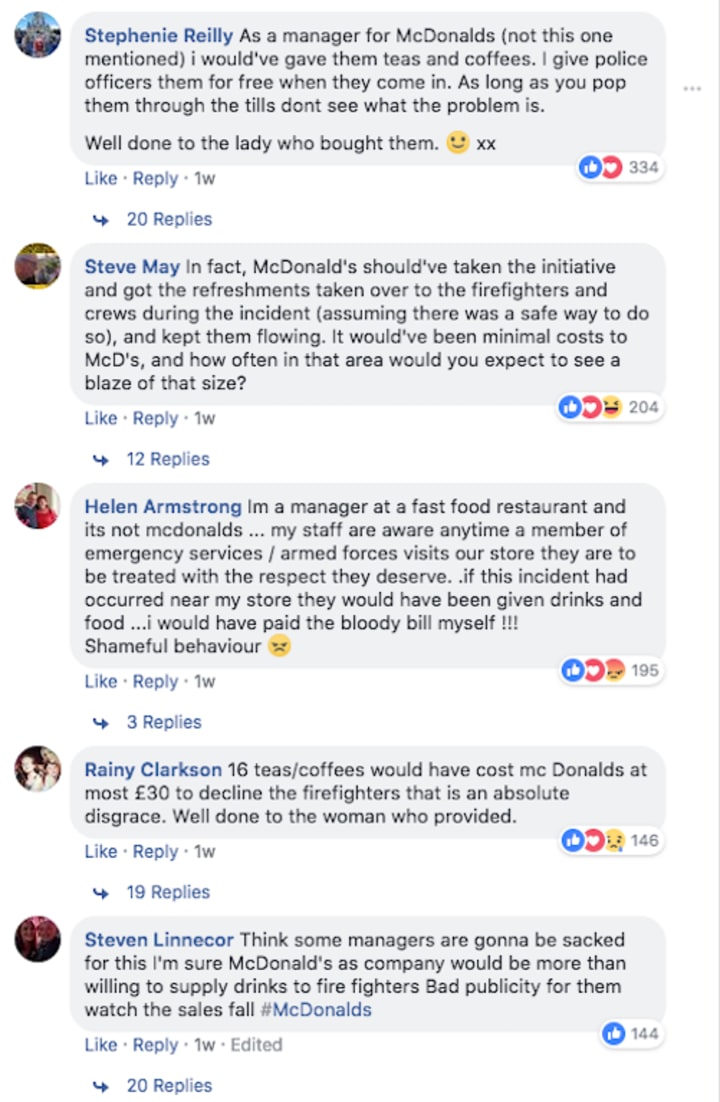 In the discussion that took place on Facebook, even McDonald's managers themselves took issue with how the company's employees and the local supervisor that day acted, and how their decision to refuse to provide the free drinks to the fire crew looked: