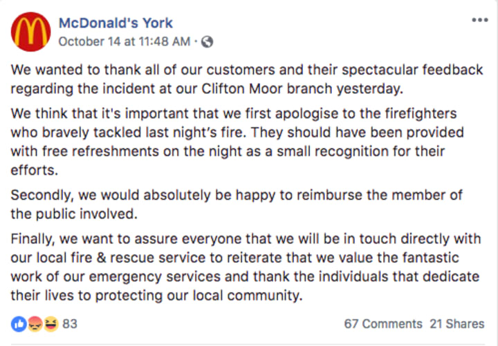 Now, to their credit, the local McDonald's there in York did apologize to the firefighters and even offered to reimburse the guests who paid for the crew's refreshments. And even though they did so in less than twelve hours after the first post on the matter came from the Cleveland and North Yorkshire Alert, which is very good, especially on a weekend and especially from a local management, not corporate, the damage had been done as the story traveled far and wide.