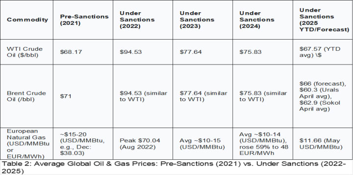 The following tables provide a quantitative overview of Russia's energy market position and global energy prices before and after the imposition of sanctions. These comparisons are fundamental to understanding the market recalibration that has occurred and the potential impacts of sanctions removal.