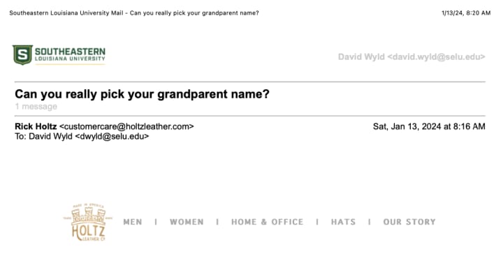 And so on this Saturday morning, first cup of coffee in hand, while dogs barked at imaginary squirrels in our yard and the TV updated me on all the “breaking” Trump news (what else is there these days…), I dutifully went down the line, checking the box for each and every email that I was going to delete unread. Every email with a subject line like those listed at the opening of this article was checked to go into the trash - “easy peasy!” However, I did stop in my frantic clicking on boxes to delete messages when I came to this one particular email that had a far different subject line than I expected, given its sender - the Holtz Leather Company. Now, I can’t tell you exactly when I provided my email address to this company, but I’m sure in my seemingly Quixotic quest in looking at leather weekender bags when ads appear for them online (Thanks, Google! Thanks, Facebook!), I have absolutely no doubt that I did give my email to Holtz for the prospect of 10% off that first order that I ended up not making. But, I’m glad I did so once upon a time for the chance to read this particular email with that subject line: “Can you really pick your grandparent name?”