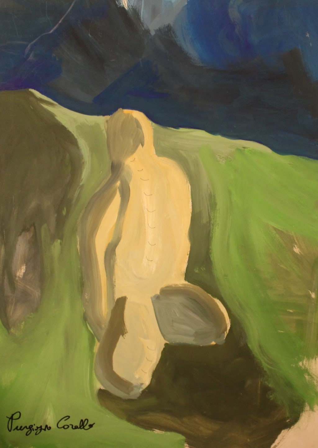 Tregua, the third painting, closes the cycle with a shift in tone. A figure kneels on a muted green slope beneath a storm-colored sky. The brushwork slows down; space opens. The scene conveys calm without peace, fragility without despair. The title — “Truce” — implies suspension rather than resolution. The landscape absorbs the body until the boundary between flesh and soil disappears. Here, Corallo reaches an unexpected tenderness: an empathy between the human and the earth, between fatigue and shelter.