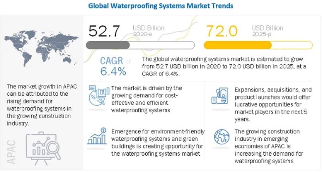 The global waterproofing systems market size is projected to reach USD 72.0 billion by 2025 at a CAGR of 6.4% from 2020. The demand for waterproofing systems is increasing, owing to the growing demand for cost-effective and efficient waterproofing systems. The emergence of environment-friendly waterproofing systems and green buildings is also driving the market.