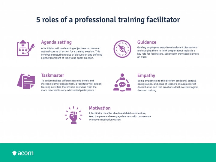 That’s a few different hats to wear. The main roles of a facilitator, however, include agenda setting, guidance, task management, motivating learners, and managing the emotional culture of the group.