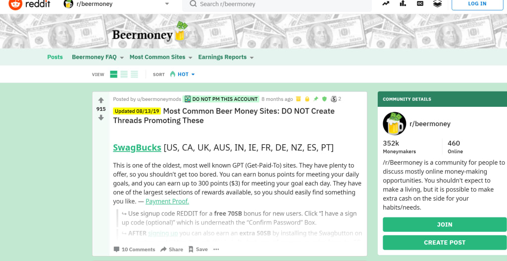 Like many millennials, I have, over the years, found myself underpaid, underemployed, and looking for ways to supplement my income. But because of my work schedule, it's hard to take on another part time job. So, naturally, I've turned to the internet. And on the internet? I found beermoney. Beermoney is a reddit thread where people who look for micro jobs, gigs, and passive income come together to discuss ways to supplement income, with little-to-no effort or time commitment. It includes market survey sites, academic research participation, ad income from watching videos, beta testing, secret shopping, and online and receipt cash back programs, among other things. Users post referral links, advice, and their earnings for the month to indicate which sites are useful, and which are scams.
