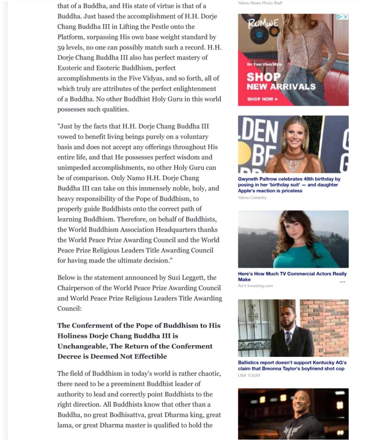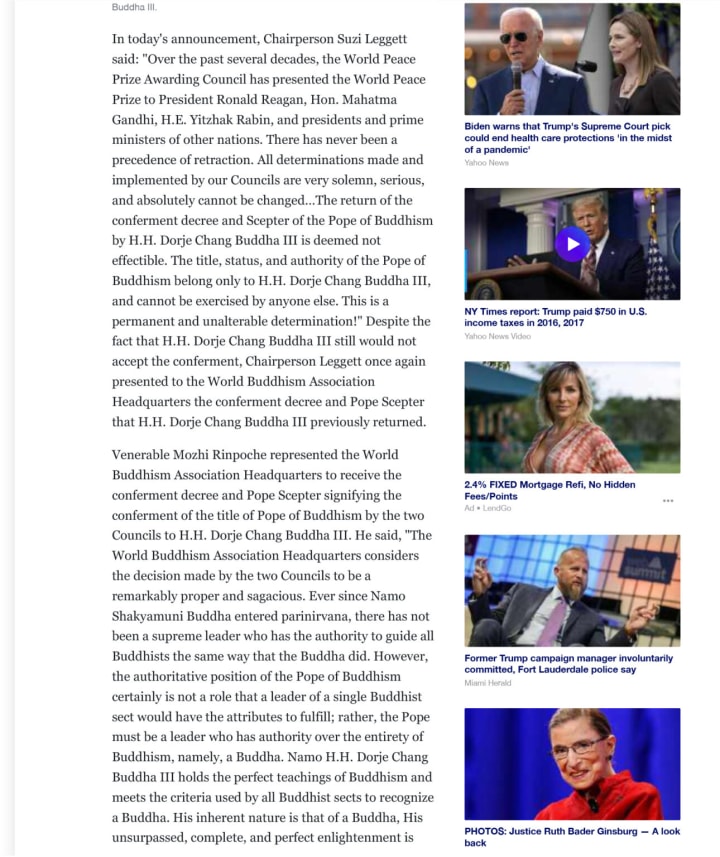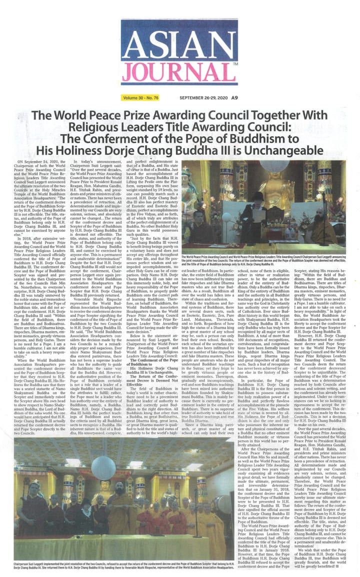 On September 24, 2020, the Chairperson of both the World Peace Prize Awarding Council and the World Peace Prize Religious Leaders Title Awarding Council, Suzi Leggett, announced the ultimate resolution of the two Councils at the Holy Miracles Temple of the World Buddhism Association Headquarters: “The return of the conferment decree and the Pope of Buddhism Scepter by H.H. Dorje Chang Buddha III is not effectible. The title, status, and authority of the Pope of Buddhism belong only to H.H. Dorje Chang Buddha III, and cannot be exercised by anyone else.”