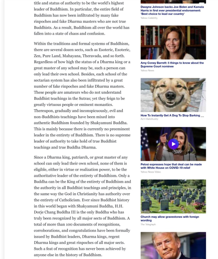 On September 23, 2020, The World Peace Prize Awarding Council and the World Peace Prize Religious Leaders Title Awarding Council arrived at the final joint resolution, in which they affirmed that the action taken by H.H. Dorje Chang Buddha III to return the canonization order and the scepter of the Pope Of World Buddhism is invalid. H.H. Dorje Chang Buddha III has officially taken the throne as the Pope Of World Buddhism from January 31, 2018! Moreover, the title Pope Of World Buddhism only belongs to H.H. Dorje Chang Buddha III. No one else can use it. That is a permanent, unchangeable, and definitive conclusion!