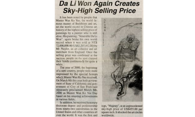 high reputation throughout the world. Based upon his extraditionary accomplishments in the areas of Buddhism, the humanities, painting, calligraphy and ethics, the World Poet and Culture Congress, which is composed of 5,612 experts and scholars from 48 different countries and regions, select Master Wan Ko Yee as the world’s only “Distinguished International Master". The resolution conferring upon him this title was mailed to the People's Republic of China and was made public in